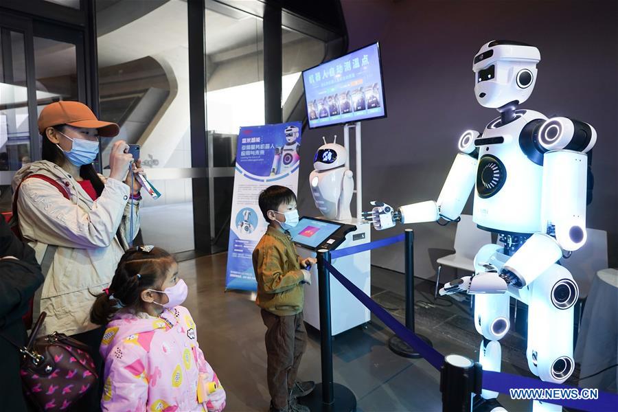 People watch a robot displayed at a new technology and products exhibition during the 2020 China Science Fiction Conference in Beijing, capital of China, Nov. 11, 2020. The fifth China Science Fiction Conference was opened here on Sunday. Jointly organized by the China Association for Science and Technology (CAST) and the Beijing municipal government, this year's conference features both online and offline events, including an opening ceremony, forums and exhibitions. (Xinhua/Ju Huanzong)