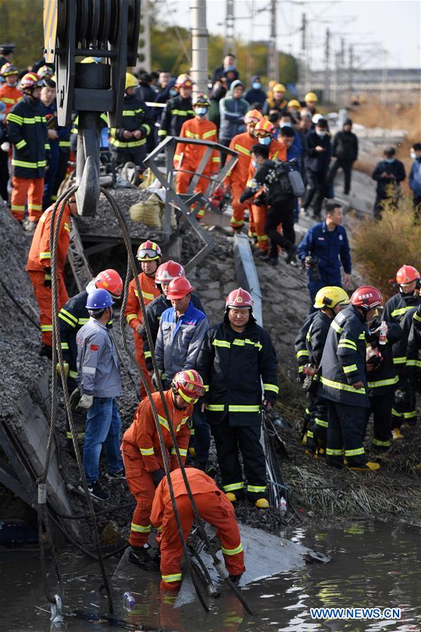 Rescuers work at the site of a collapsed bridge in Tianjin, north China, Nov. 1, 2020. Seven people have been confirmed dead and five others injured after a railway bridge collapsed in north China's Tianjin Municipality on Sunday, said local authorities. (Xinhua/Zhao Zishuo)