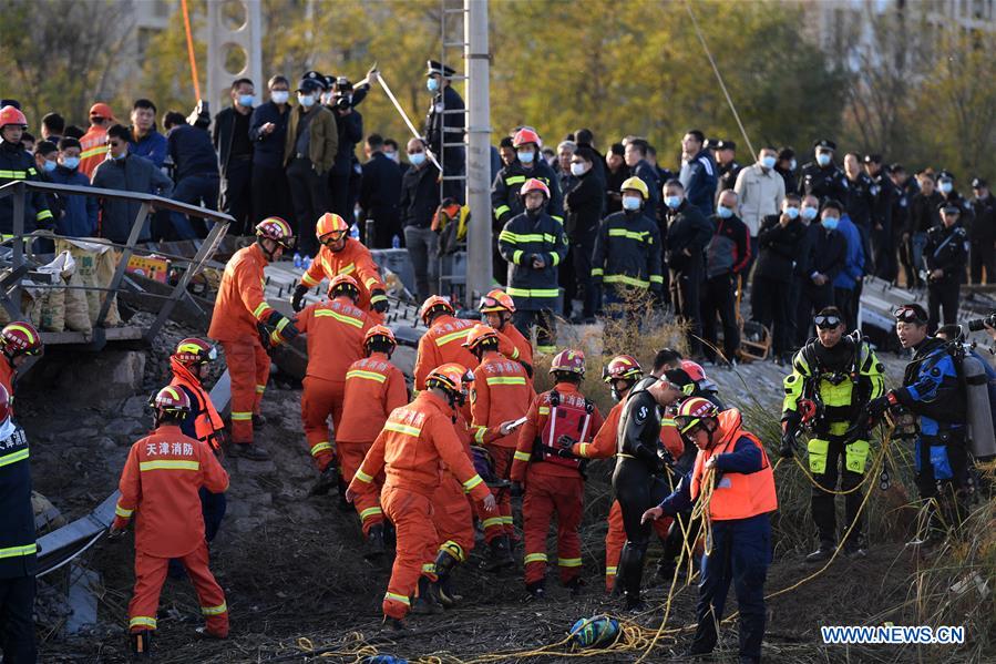 Rescuers work at the site of a collapsed bridge in Tianjin, north China, Nov. 1, 2020. Seven people have been confirmed dead and five others injured after a railway bridge collapsed in north China's Tianjin Municipality on Sunday, said local authorities. (Xinhua/Zhao Zishuo)