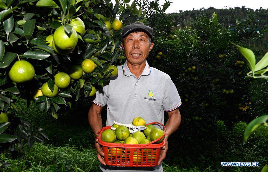 A staff member shows a basket of green oranges at a demonstration base in Qiongzhong, south China's Hainan Province, Nov. 1, 2020. With a planting area of about 29,000 mu (about 1,933 hectares), the green orange output in Qiongzhong is expected to reach 5,000 tonnes. (Xinhua/Yang Guanyu)
