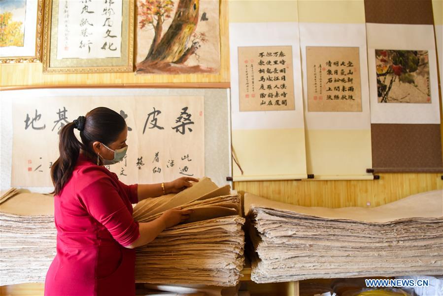 A craftswoman arranges mulberry-bark paper in Moyu County of Hotan, northwest China's Xinjiang Uygur Autonomous Region, Nov. 1, 2020. Mulberry-bark paper making, a craft of over 1,300 years of history, is listed as a Chinese national intangible cultural heritage. The paper boasts a quality of being antiseptic, absorbent and tensile. (Xinhua/Ding Lei)