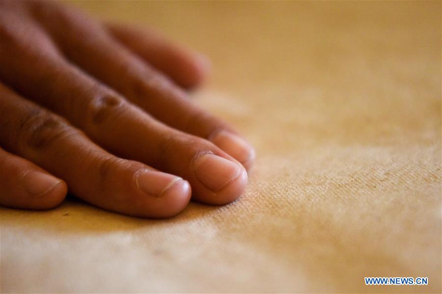 A craftswoman checks a piece of mulberry-bark paper in Moyu County of Hotan, northwest China's Xinjiang Uygur Autonomous Region, Nov. 1, 2020. Mulberry-bark paper making, a craft of over 1,300 years of history, is listed as a Chinese national intangible cultural heritage. The paper boasts a quality of being antiseptic, absorbent and tensile. (Xinhua/Ding Lei)