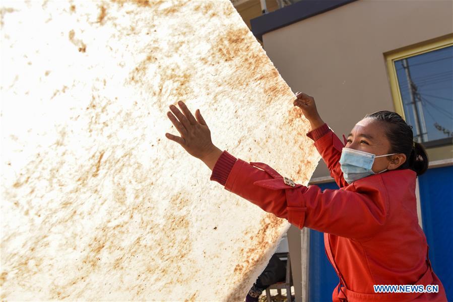 A craftswoman checks a piece of mulberry-bark paper in Moyu County of Hotan, northwest China's Xinjiang Uygur Autonomous Region, Nov. 1, 2020. Mulberry-bark paper making, a craft of over 1,300 years of history, is listed as a Chinese national intangible cultural heritage. The paper boasts a quality of being antiseptic, absorbent and tensile. (Xinhua/Ding Lei)