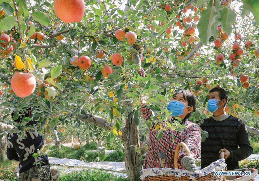 Farmers pick apples at a garden in Aksu of northwest China's Xinjiang Uygur Autonomous Region, Oct. 31, 2020. Over 380,000 mu (about 25,333 hectares) of apples have entered harvest season in Aksu. (Xinhua/Zhang Man)