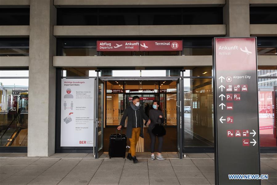 Two passengers leave the newly-opened Berlin Brandenburg Airport in Schoenefeld, Germany, on Nov. 1, 2020. Following several delays, Berlin Brandenburg Airport opened to the public on Oct. 31. (Xinhua/Shan Yuqi)