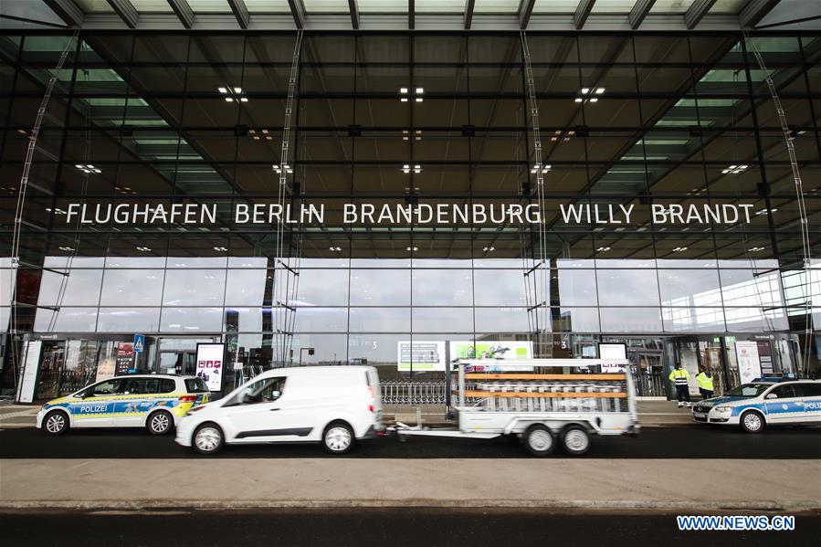 A vehicle passes the newly-opened Berlin Brandenburg Airport in Schoenefeld, Germany, on Nov. 1, 2020. Following several delays, Berlin Brandenburg Airport opened to the public on Oct. 31. (Xinhua/Shan Yuqi)
