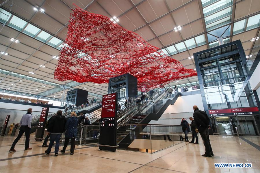 Photo taken on Nov. 1, 2020 shows an interior view of the newly-opened Berlin Brandenburg Airport in Schoenefeld, Germany. Following several delays, Berlin Brandenburg Airport opened to the public on Oct. 31. (Xinhua/Shan Yuqi)