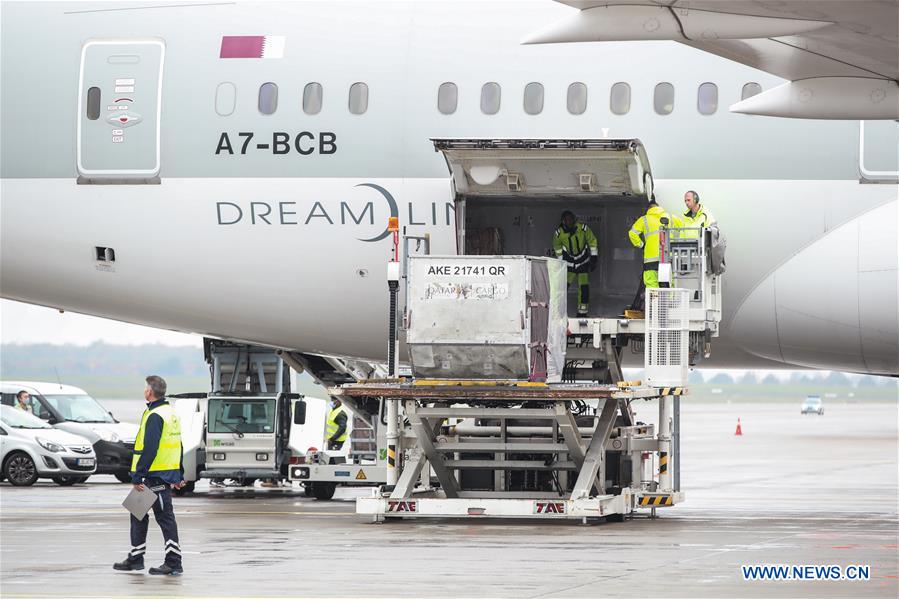 Staff members work at the newly-opened Berlin Brandenburg Airport in Schoenefeld, Germany, on Nov. 1, 2020. Following several delays, Berlin Brandenburg Airport opened to the public on Oct. 31. (Xinhua/Shan Yuqi)