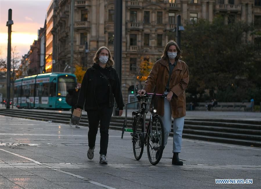 Two pedestrians wearing face masks walk on a street in Frankfurt, Germany, on Nov. 2, 2020. New COVID-19 infections in Germany increased by 12,097 within one day to a total of 545,027 as the country entered its second partial lockdown, the federal government agency for disease control and prevention Robert Koch Institute (RKI) announced on Monday. (Xinhua/Lu Yang)