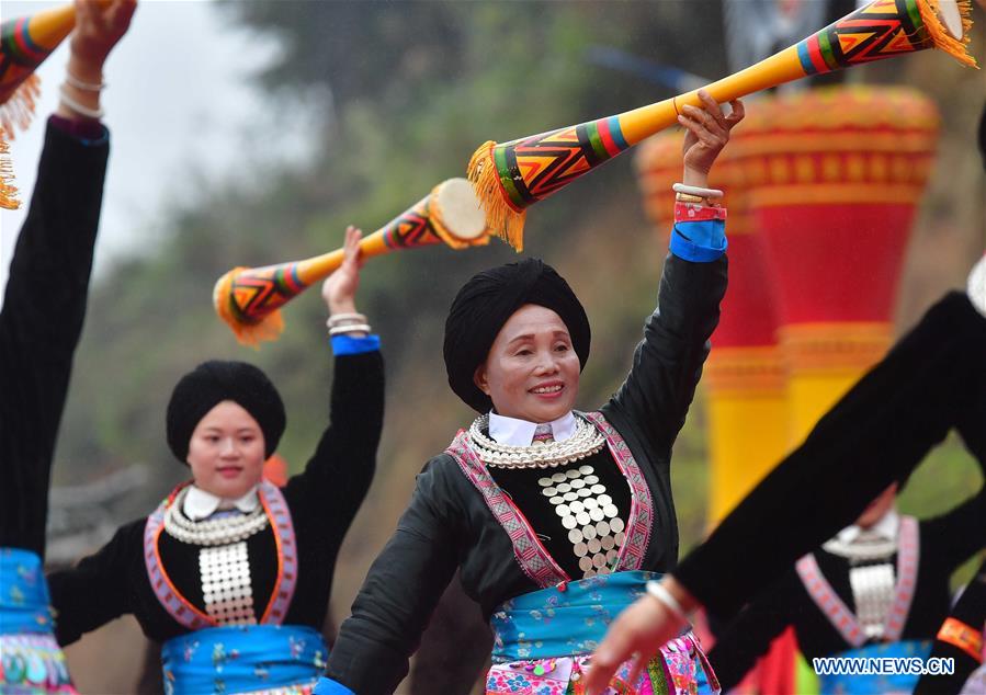 People dance to greet advent of New Year in Ameiqituo Town, Guizhou