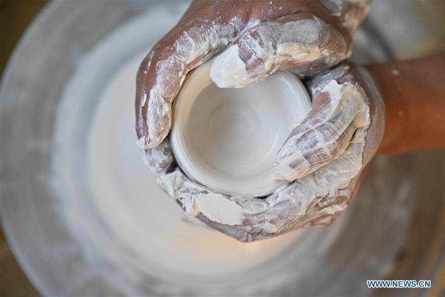 Artisan Xu Jinbao prepares an earthen base for white porcelain teaware in Dehua County, Quanzhou, southeast China's Fujian Province, Oct. 20, 2020. A major porcelain-production center, Dehua in southeast China's Fujian Province has been making export porcelain since the Song Dynasty (960-1279 AD). The plain white porcelain crafted here was later dubbed "Blanc de Chine (White from China)" by the French and gained worldwide fame. As one of the traditional dragon kilns with long, thin and slightly sloped structures, the only remaining ancient kiln in Dehua is the Yueji Kiln, which has been burning continuously for more than 400 years. While the city preserves the ancient kiln, there are new-generation artisans seeking creativity on top of heritage. Xu Jinbao, who'd rather define himself as a "technical artisan", is among such innovators in the porcelain manufacturer circle of Dehua. After graduating from Shanghai Jiao Tong University with a degree in materials science, Xu returned to Dehua and set up a technology company which aims at finding improved ceramic solutions by making tweaks to the ingredients. Xu's ceramics products feature better heat-resistant, corrosion-proof and absorption performances than their older, traditional counterparts. He and colleagues have already debuted ceramic kettles which work on direct heat, and ceramic filters for water purifiers will be introduced soon. Like Xu Jinbao and his company, a growing number of Dehua-based porcelain enterprises have optimized production via technical upgrades, securing orders with a continuous supply of state-of-the-art, quality "Blanc de Chine" to global clients. (Xinhua/Song Weiwei)