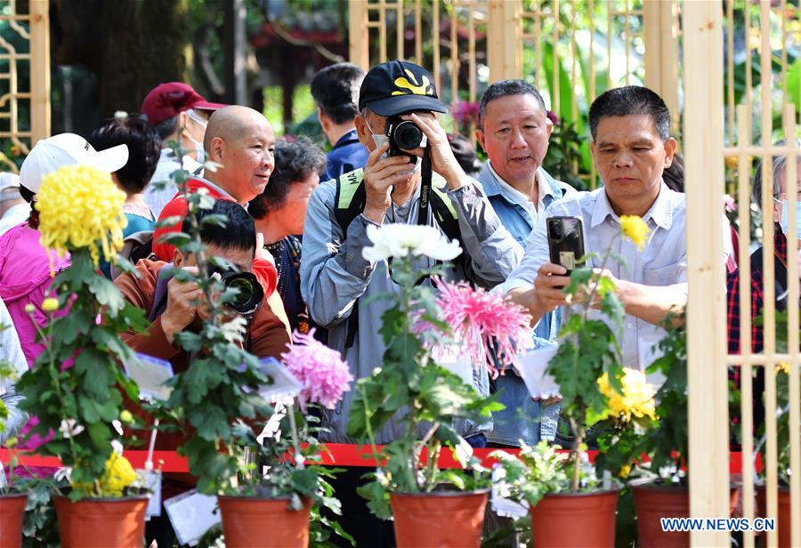 People take photos of chrysanthemums at an exhibition in Fuzhou, capital of southeast China's Fujian Province, Nov. 3, 2020. More than 1,000 varieties of over 20,000 pots chrysanthemums are displayed in an exhibition at the West Lake Park here on Tuesday. (Xinhua/Wei Peiquan)