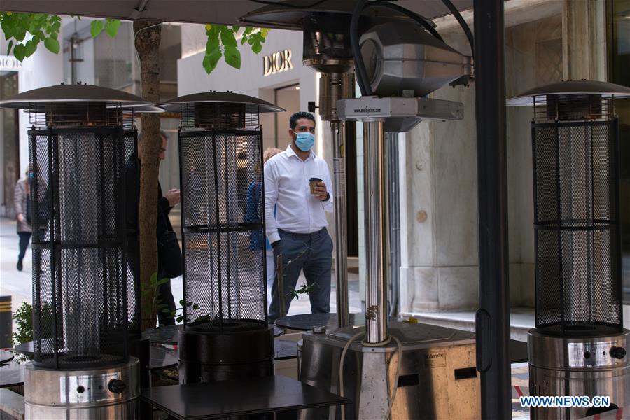 A man wearing a mask passes by a closed cafe in Athens, Greece, on Nov. 3, 2020. Amidst the surge of cases, Greek Prime Minister Kyriakos Mitsotakis earlier on Oct. 31 announced a new set of restrictions that will start on Nov. 3 and will last until December in an effort to avoid a full nationwide lockdown like the one imposed in spring. In regions of high alert with heavy epidemiological load, which include Attica, restaurants and cafeterias are closing with the exception of take away and delivery services. (Xinhua/Marios Lolos)