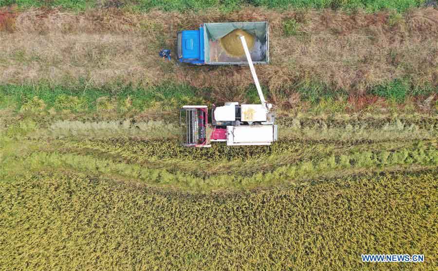 Aerial photo taken on Nov. 3, 2020 shows a farmer loading harvested paddy rice in Jiangxiang Town, Nanchang of east China's Jiangxi Province. (Xinhua/Peng Zhaozhi)