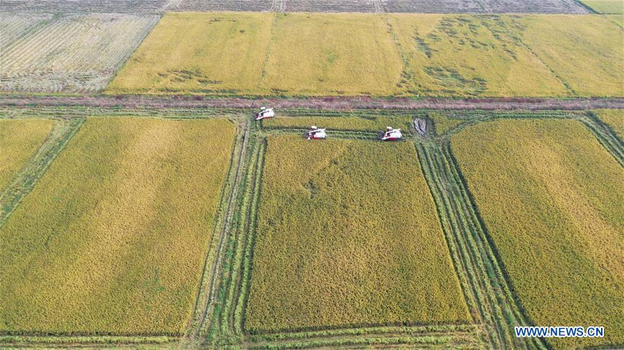 Aerial photo taken on Nov. 3, 2020 shows farmers harvesting paddy rice in Jiangxiang Town, Nanchang of east China's Jiangxi Province. (Xinhua/Peng Zhaozhi)