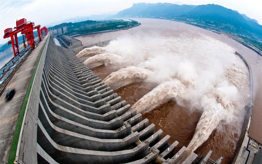 File photo taken on July 10, 2012 shows water gushing out from the Three Gorges Dam in central China's Hubei Province. The Three Gorges project, which manages the flow of water on China's Yangtze River, has been officially certified as complete and fully functioning, authorities announced on Sunday. China's Ministry of Water Resources and the National Development and Reform Commission announced the official full completion of the project's construction, saying it has met all design requirements, has a good overall performance, and fulfills the key roles of flood control, electricity generation, shipping and water-resource utilization. (Xinhua/Xiao Yijiu)