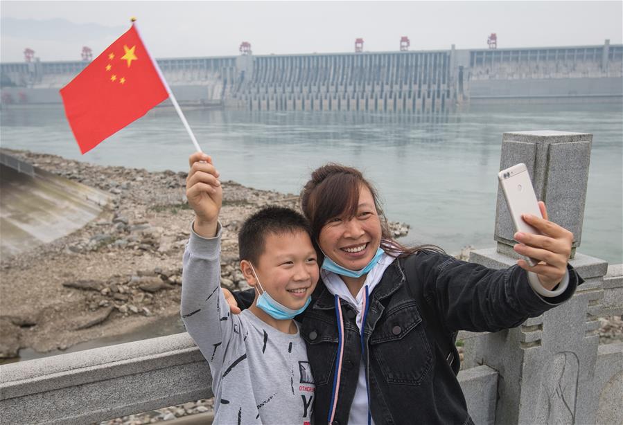 Visitors take a selfie at a park near the Three Gorges Project in Yichang City, central China's Hubei Province, Nov. 1, 2020. The Three Gorges project, which manages the flow of water on China's Yangtze River, has been officially certified as complete and fully functioning, authorities announced on Sunday. China's Ministry of Water Resources and the National Development and Reform Commission announced the official full completion of the project's construction, saying it has met all design requirements, has a good overall performance, and fulfills the key roles of flood control, electricity generation, shipping and water-resource utilization. (Xinhua/Xiao Yijiu)