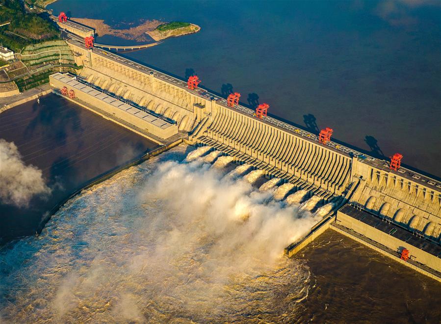 Aerial photo taken on Aug. 19, 2020 shows water gushing out from the Three Gorges Dam in central China's Hubei Province. The Three Gorges project, which manages the flow of water on China's Yangtze River, has been officially certified as complete and fully functioning, authorities announced on Sunday. China's Ministry of Water Resources and the National Development and Reform Commission announced the official full completion of the project's construction, saying it has met all design requirements, has a good overall performance, and fulfills the key roles of flood control, electricity generation, shipping and water-resource utilization. (Xinhua/Xiao Yijiu)