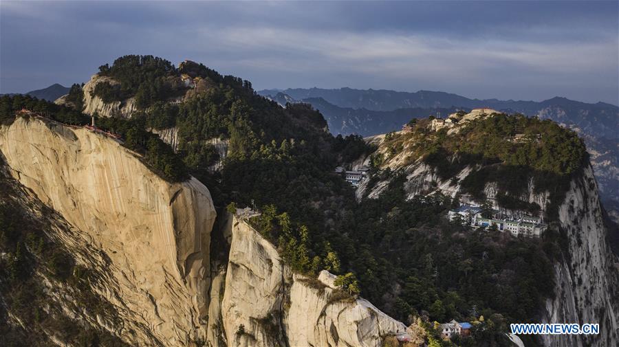 Aerial photo taken on Nov. 3, 2020 shows the East Peak of Mount Huashan at dawn in northwest China's Shaanxi Province. (Xinhua/Tao Ming)