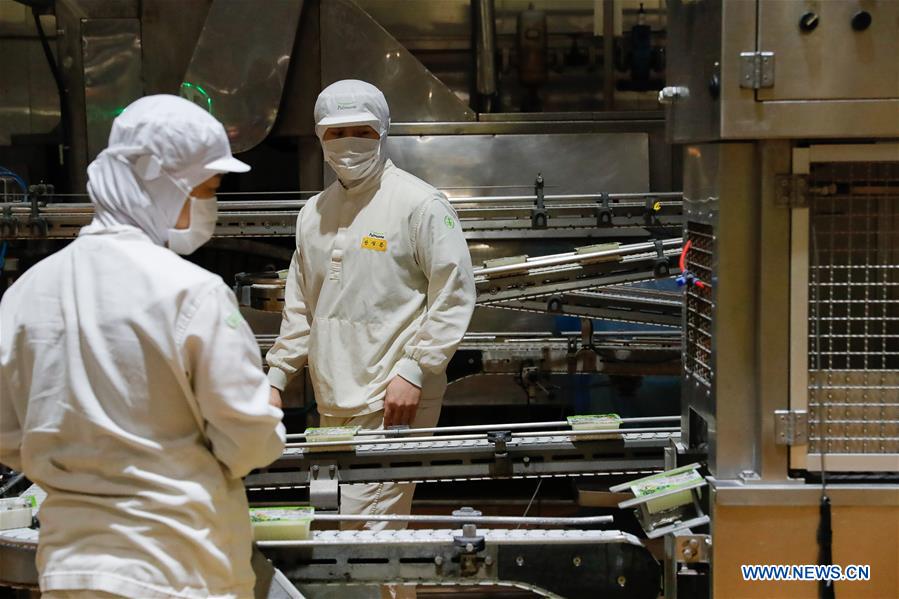 Staff members work at a tofu plant of Pulmuone in Eumseong-gun of Chungcheongbuk-do, South Korea, Nov. 3, 2020. Pulmuone, a leading food company in South Korea, will be an exhibitor at the third China International Import Expo (CIIE), which will take place from Nov. 5 to 10 in Shanghai. (Xinhua/Wang Jingqiang)