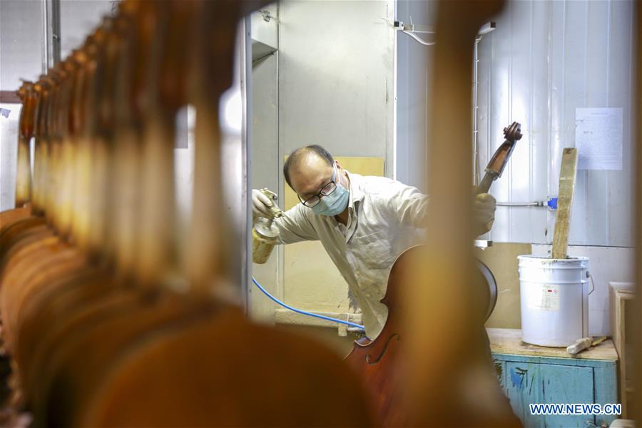 A worker sprays paint at a workshop in Huangqiao Town of Taixing, east China's Jiangsu Province, Nov. 3, 2020. As a famed bowed string instruments manufacturing area in China, Huangqiao Town now has over 200 manufacturers and companies with more than 35,000 employees in the industry. Over 700,000 bowed string instruments are produced here every year, accounting for about 30 percent of the total number made in the world. (Photo by Tang Dehong/Xinhua)