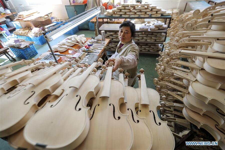 A worker arranges violins at a workshop in Huangqiao Town of Taixing, east China's Jiangsu Province, Nov. 3, 2020. As a famed bowed string instruments manufacturing area in China, Huangqiao Town now has over 200 manufacturers and companies with more than 35,000 employees in the industry. Over 700,000 bowed string instruments are produced here every year, accounting for about 30 percent of the total number made in the world. (Photo by Tang Dehong/Xinhua)