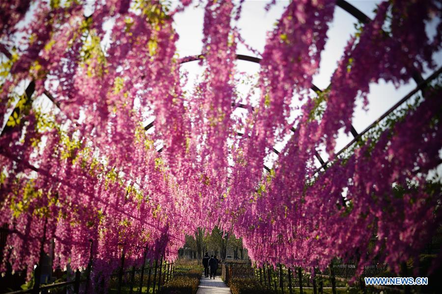 Visitors walk through an arbour at a rural tourism complex in Fengnan District of Tangshan, north China's Hebei Province, Nov. 3, 2020. (Xinhua/Xing Guangli)