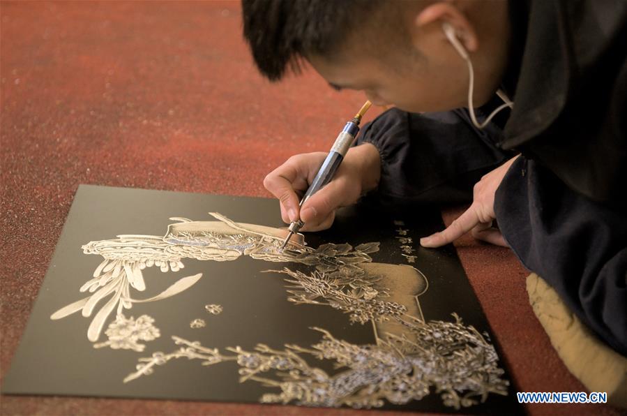 A craftsman engraves on a copper plate at a company in Jinzhou City of Shijiazhuang, capital of north China's Hebei Province, Nov. 3, 2020. Companies started to prepare for the upcoming Singles Day sale, an online shopping festival. (Photo by Pu Dongfeng/Xinhua)