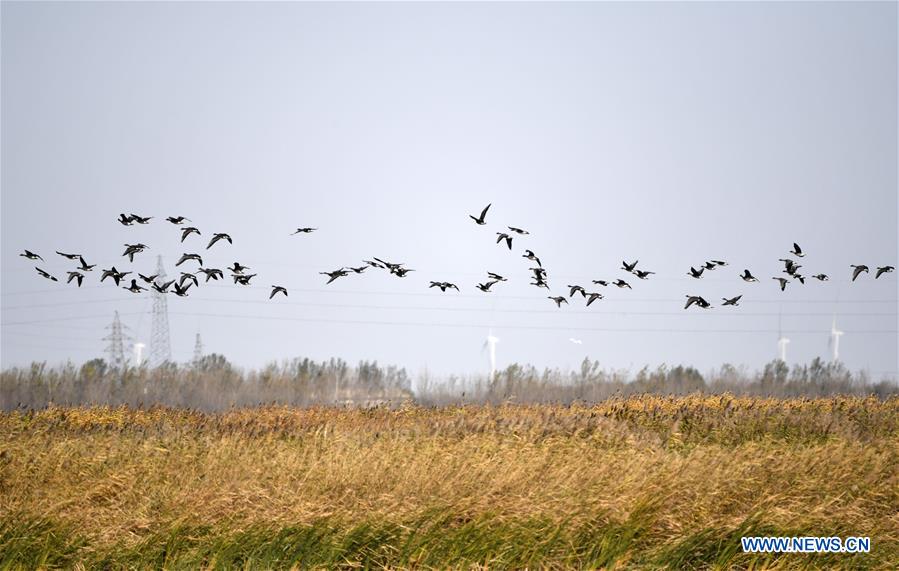 Migrant birds fly over the Qilihai wetland in Ninghe District, north China's Tianjin Municipality, Nov. 3, 2020. (Xinhua/Li Ran)