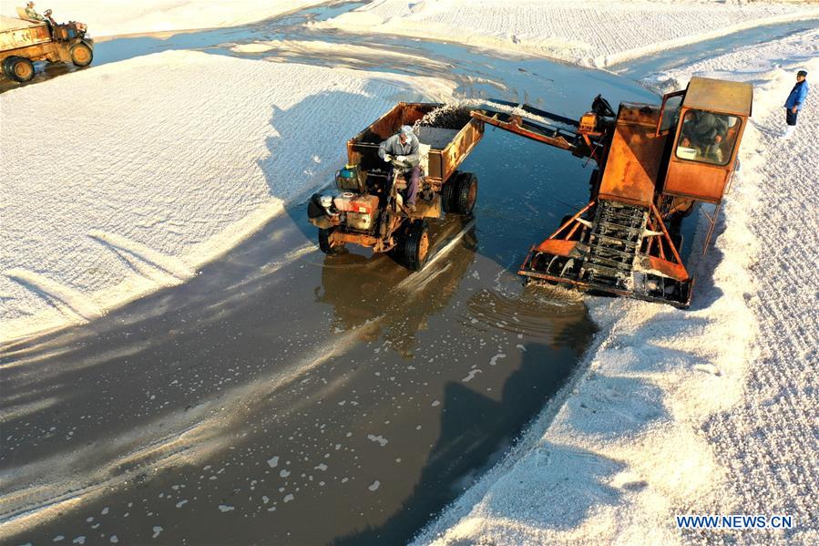 Aerial photo taken on Nov. 4, 2020 shows workers collecting salt in a salt pond at Dongfeng salt field in Qingdao, east China's Shandong Province. Dongfeng salt field has entered the harvest season recently. (Photo by Liang Xiaopeng/Xinhua)
