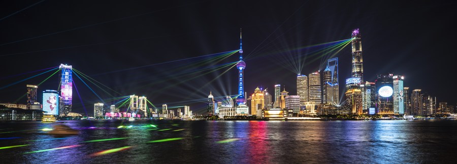 Photo taken on Nov. 4, 2020 shows a light show at the Lujiazui area in Shanghai, east China. (Xinhua/Zhang Haofu)