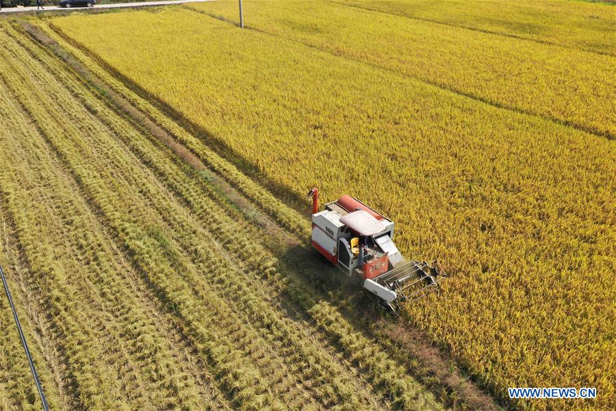 Aerial photo taken on Nov. 5, 2020 shows a farmer harvesting paddy rice in Qingcheng Village, Wanzai County of Yichun City, east China's Jiangxi Province. (Xinhua/Zhou Mi)