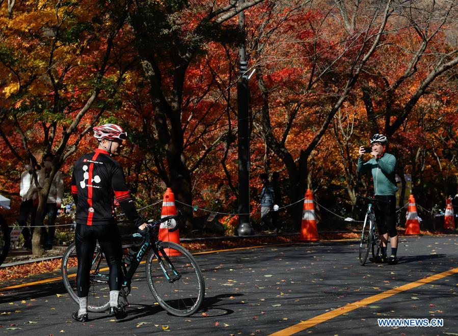 Cyclists take pictures near maple trees at Naejangsan National Park in Jeongeup City of North Jeolla Province, South Korea, Nov. 8, 2020. Naejangsan is a popular tourist destination in South Korea, particularly in autumn due to its spectacular maple scenery. (Xinhua/Wang Jingqiang)