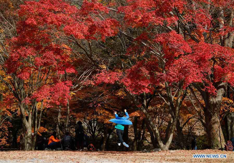 A boy plays under maple trees at Naejangsan National Park in Jeongeup City of North Jeolla Province, South Korea, Nov. 8, 2020. Naejangsan is a popular tourist destination in South Korea, particularly in autumn due to its spectacular maple scenery. (Xinhua/Wang Jingqiang)