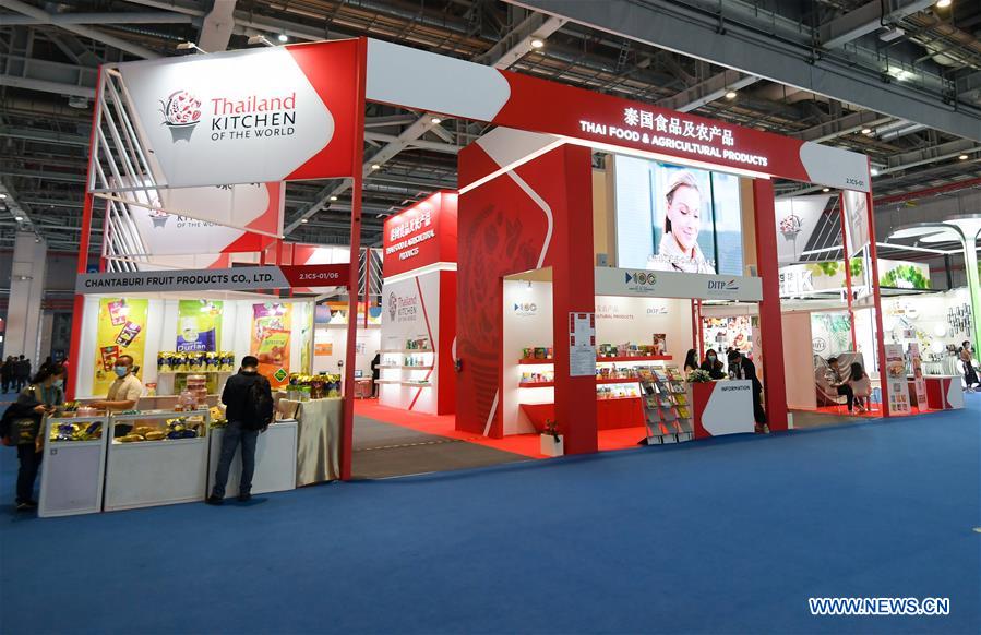 Photo taken on Nov. 7, 2020 shows the exhibition booth of Thai food and agricultural products at the Food and Agricultural Products exhibition area during the third China International Import Expo (CIIE) in Shanghai, east China. Global food and agricultural product companies gather at the on-going CIIE, making the exhibition more appetizing. (Xinhua/Chen Yehua)