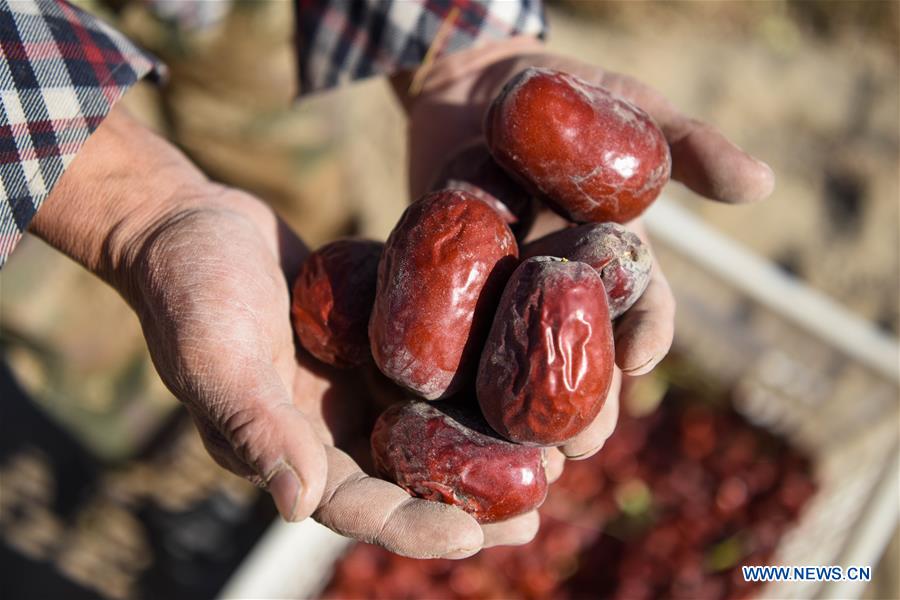 A farmer shows newly-harvested red jujubes in Hotan County of Hotan Prefecture, northwest China's Xinjiang Uygur Autonomous Region, Nov. 6, 2020. A total of 890,000 mu (about 59,333 hectares) of red jujubes have entered harvest season in the prefecture. The jujube trees cultivation here has increased local villagers' income in recent years. (Xinhua/Ding Lei)
