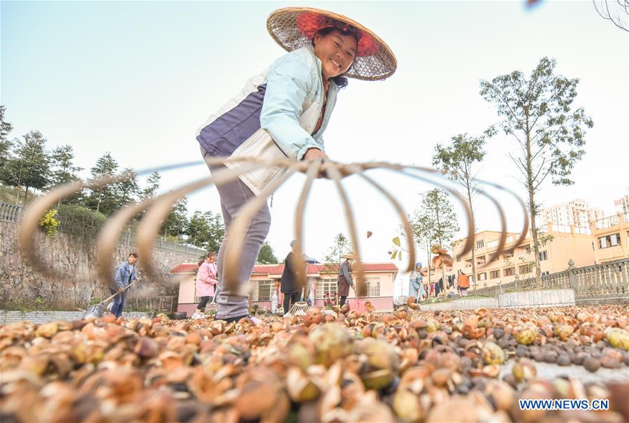 A villager airs fruits of oil-tea camellia at an oil-tea factory in Songtao Miao Autonomous County, Tongren City, southwest China's Guizhou Province, Nov. 8, 2020. More than 180,000 mu(about 12,000 hectares) of oil-tea camellia have been planted here in Songtao to boost income of local villagers. (Photo by Long Yuanbin/Xinhua)