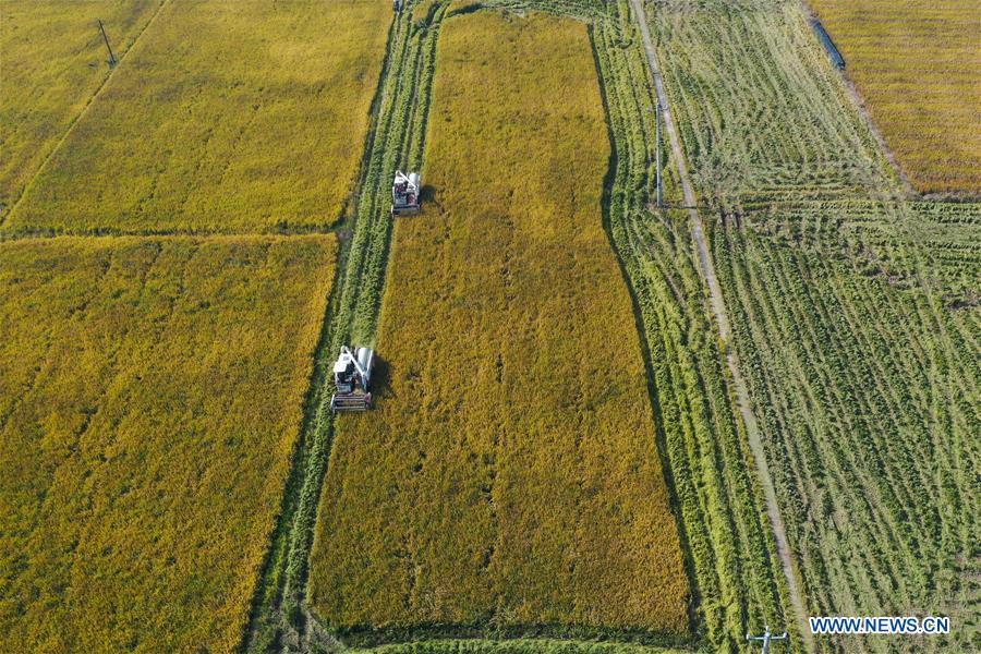 Aerial photo taken on Nov. 10, 2020 shows farmers harvesting paddy rice in Bazishao Township of Heshan District in Yiyang, central China's Hunan Province. Farmers take advantage of clear weather harvesting paddy rice. (Xinhua/Xue Yuge)