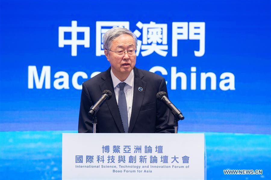 Zhou Xiaochuan, vice chairman of the Boao Forum for Asia (BFA), addresses the first conference of the International Forum on Science, Technology and Innovation (ISTIF) of the BFA in Macao, south China, Nov. 10, 2020. The first conference of the ISTIF of the BFA opened here on Tuesday. (Xinhua/Cheong Kam Ka)