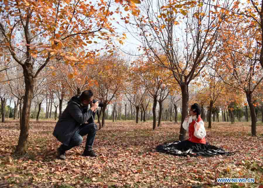 Sun Yan, an online clothes store owner, poses for photos to promote the costume she designed in the style of the traditional clothing of the Han ethnic group that is generally called Hanfu in Sunzhuang Village in Caoxian County of Heze City, east China's Shandong Province, Nov. 10, 2020. Sunzhuang Village thrives on e-commerce business. Among some 760 households in the village, more than 560 run online clothes stores on Taobao.com, Alibaba's main e-commerce site. The village's sales volume of costumes exceeded 200 million yuan (about 30.22 million U.S. dollars) in 2019. (Xinhua/Wang Kai)