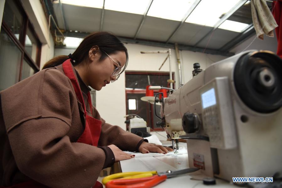 Sun Yan, an online clothes store owner, sews a costume she designed in the style of the traditional clothing of the Han ethnic group that is generally called Hanfu in Sunzhuang Village in Caoxian County of Heze City, east China's Shandong Province, Nov. 10, 2020. Sunzhuang Village thrives on e-commerce business. Among some 760 households in the village, more than 560 run online clothes stores on Taobao.com, Alibaba's main e-commerce site. The village's sales volume of costumes exceeded 200 million yuan (about 30.22 million U.S. dollars) in 2019. (Xinhua/Wang Kai)