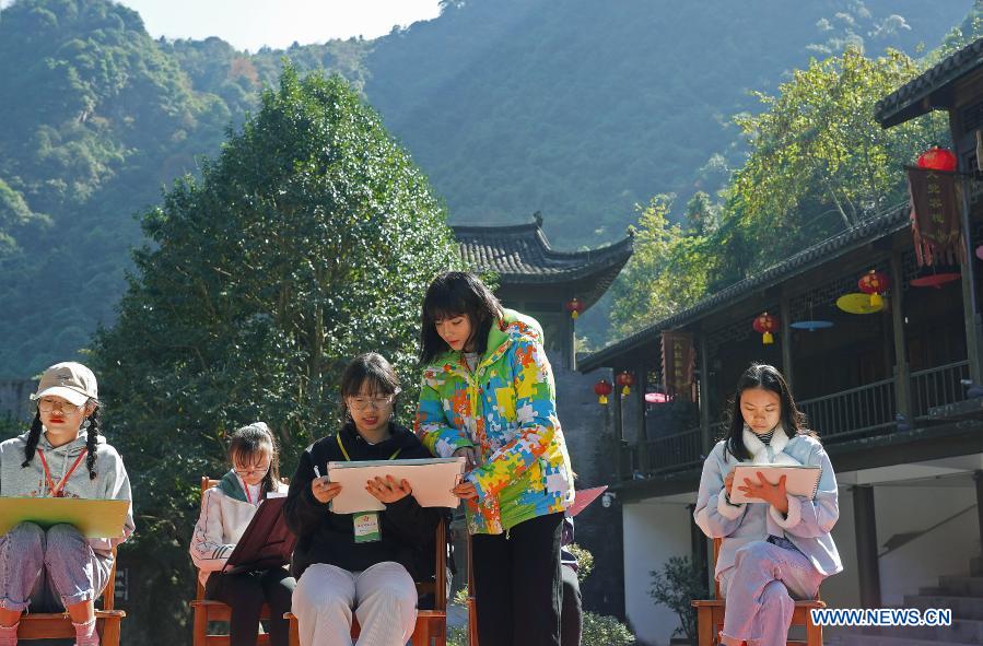 Students draw from life in Dajue Mountain Scenic Area in Zixi County, east China's Jiangxi Province, Nov. 11, 2020. Dajue Mountain Scenic Area, boasting its beautiful scenery and buildings in antique styles, becomes a popular spot for fine art majors. (Xinhua/Wan Xiang)
