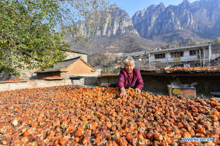 A villager sorts drying persimmons in Hongni Village in Pingshun County, north China's Shanxi Province, Nov. 11, 2020.
