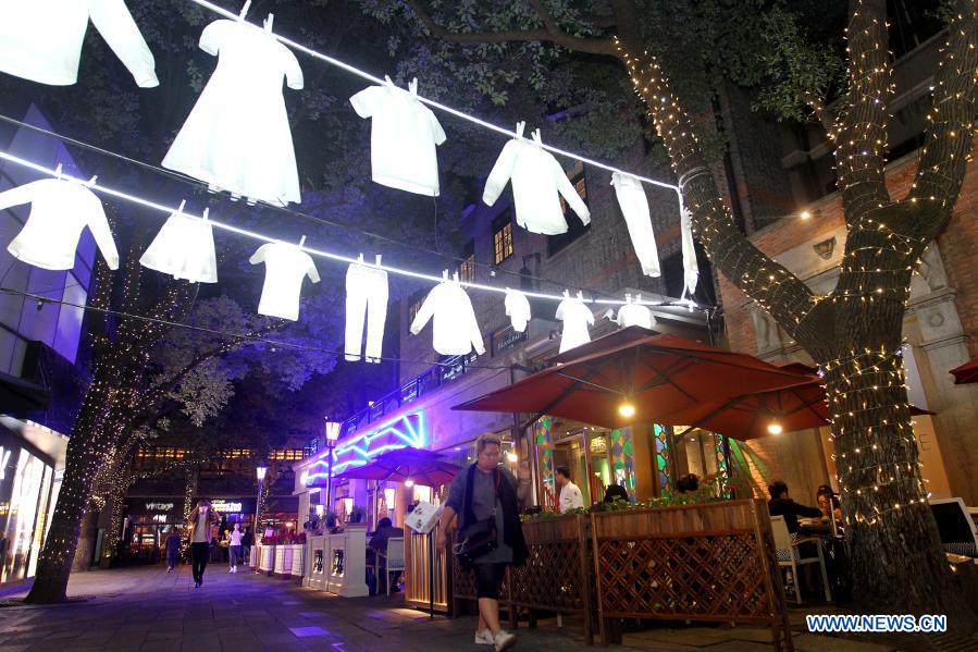 Photo taken on Nov. 16, 2020 shows an art installation displayed during Lumieres Shanghai 2020, a light festival, at the Xintiandi commercial complex in east China's Shanghai. (Xinhua/Chen Fei)