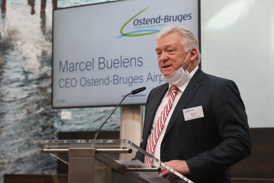 Marcel Buelens, chief executive officer (CEO) of Antwerp and Ostend-Bruges Airports, speaks at a ceremony marking the opening of new "Air Silk Road" cargo routes between China and Belgium, in Ostend-Bruges International Airport, Ostend, Belgium, Sept. 24, 2020. (Xinhua/Zheng Huansong)