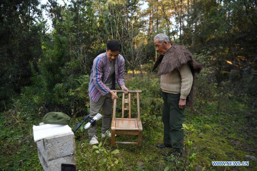 Peng Guofei (R) and his partner Peng Chaowen prepare for short video shooting at Furong Township in Xiangxi Tujia and Miao Autonomous Prefecture, central China's Hunan Province, Nov. 15, 2020. Peng Guofei, 75, is well-known as "Grandpa Fei" online. He was born and raised up in the remote Yangmu Village located deep in the Wuling mountains. With the help of local poverty relief officials, villagers get access to internet in recent year as the whole village embraces full 4G signal coverage. In the beginning of 2020, Peng took internet courses in the village to become an Internet influencer and was presented with a smart phone. Along with some post-90s, Peng built up a team in September to shoot short videos to sell agricultural products online. Their videos got lots of likes online because of the engaging content. (Xinhua/Xue Yuge)