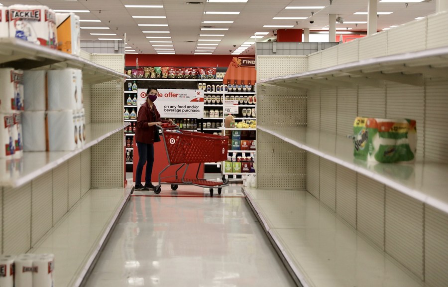 Photo taken on Nov. 20, 2020 shows almost empty retail shelves in a Target Store in Los Angeles, the United States. (Xinhua)