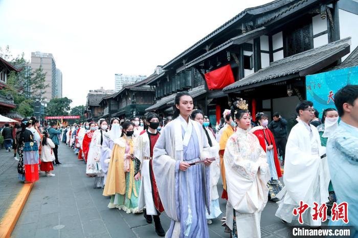 Four groups of young enthusiasts wearing Hanfu left from four different landmarks of Chengdu on Nov. 22, and arrived at Wenshufang folk culture street on the same afternoon. All the Hanfu enthusiasts, including some foreigners, then paraded down the street to celebrate the festival and show the beauty of Hanfu.