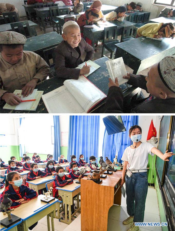 TOP: A group of students study by themselves at a boarding school in Daliyabuyi Township, Yutian County, northwest China's Xinjiang Uygur Autonomous Region, Nov. 7, 2005. (File photo) BOTTOM: A volunteer teacher teaches a science lesson to students at Bakedun Primary School in Tawakkul Township, Hotan County, northwest China's Xinjiang Uygur Autonomous Region, May 16, 2020. (Photo taken by Wang Fei) In a historic feat, northwest China's Xinjiang Uygur Autonomous Region has bidden farewell to absolute poverty. The last 10 impoverished counties in Xinjiang have managed to end absolute poverty, the regional government announced on Nov. 14. The 10 counties, including Shache County, Moyu County and Akto County, are no longer impoverished counties by official standards, the local government said in an online statement. All the 10 counties are in southern Xinjiang, where the country's largest desert is located. Local people used to have limited access to stable income and public services due to the harsh natural environment and poor infrastructure. (Xinhua)
