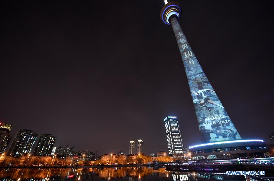 The image of football legend Diego Maradona is projected on Tianjin TV Tower in north China's Tianjin Municipality, Nov. 26, 2020. Maradona died at the age of 60 on Wednesday of a heart attack. (Xinhua/Li Ran)